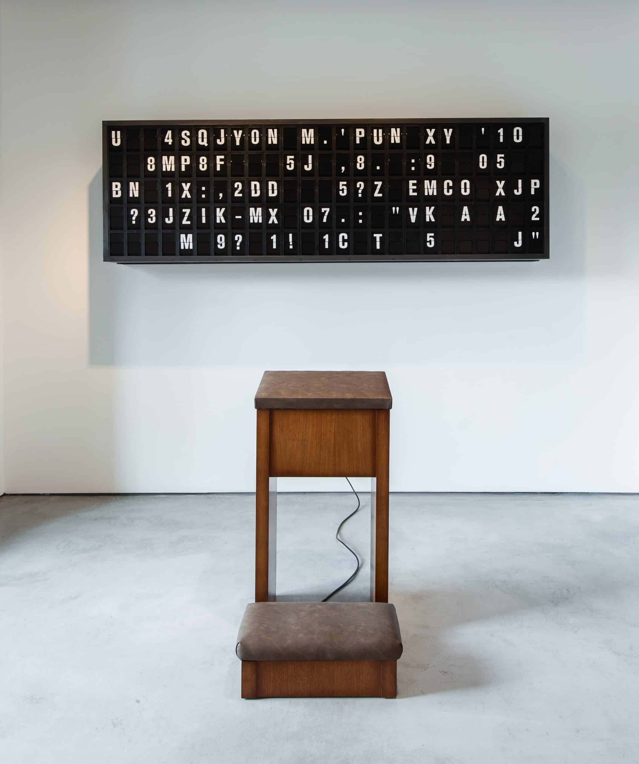 Nella sua opera Appropriate Response (2020) l’artista ha realizzato un’installazione che presenta un display a palette a scatto, simile a quelli un tempo utilizzati negli aeroporti e nelle stazioni ferroviarie, ora sostituiti da schermi digitali. Di fronte al display, è posizionato un inginocchiatoio: quando il visitatore si inginocchia, le lettere sul display cominciano a muoversi, formando una frase generata da GPT-2, un’intelligenza artificiale che l’artista ha addestrato con un corpus di 60.000 citazioni e aforismi raccolti online.